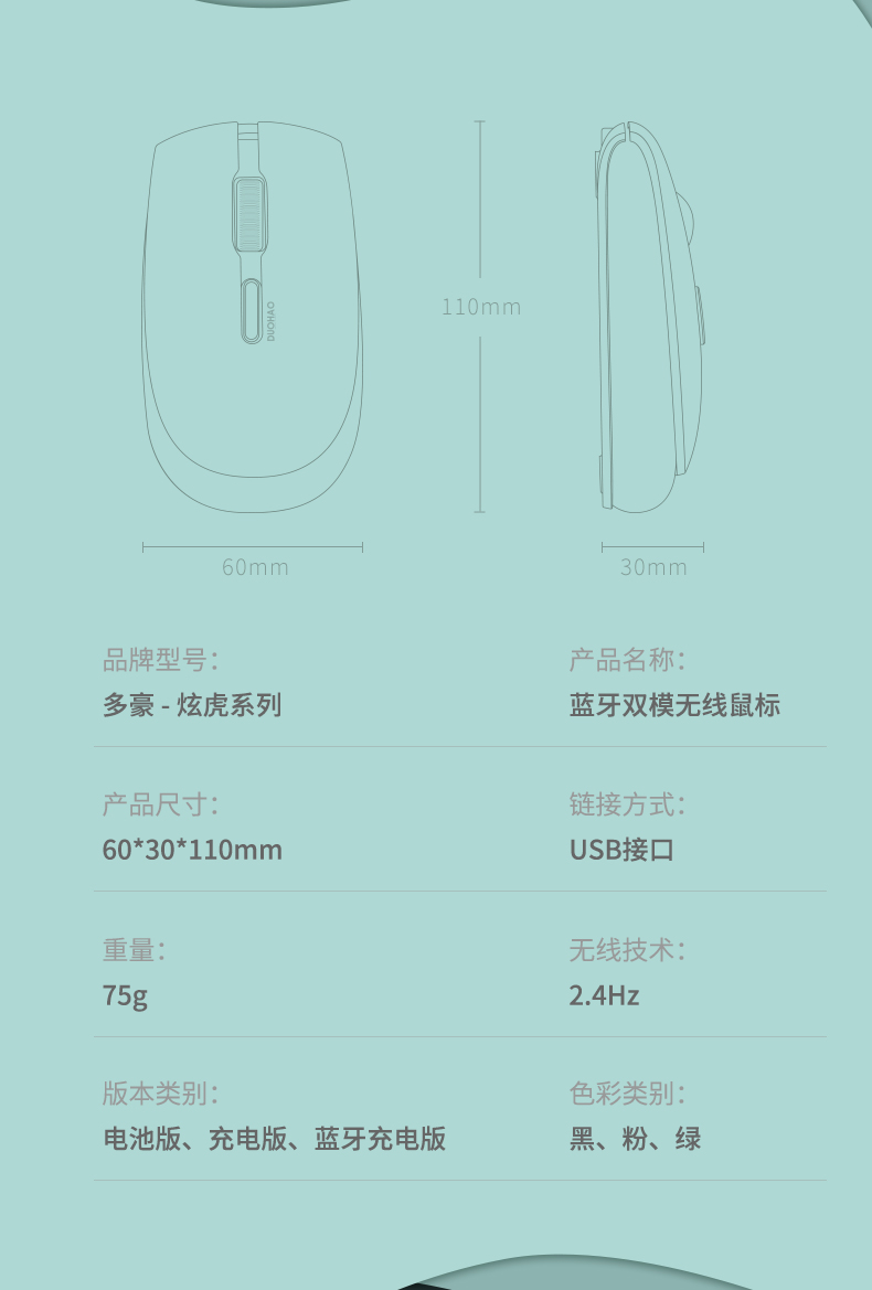 • 商品名称:多豪可充电无线鼠标 静音无声笔记本电脑台式家用办公游戏适用苹果华为联想惠普男女生通用 蓝牙双模无限鼠标