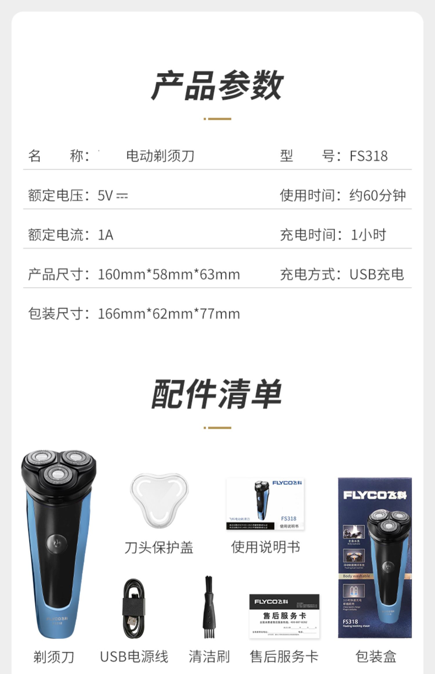 • 商品名称:飞科剃须刀电动全身水洗1小时快充男士充电式防水刮胡刀3D刀正品