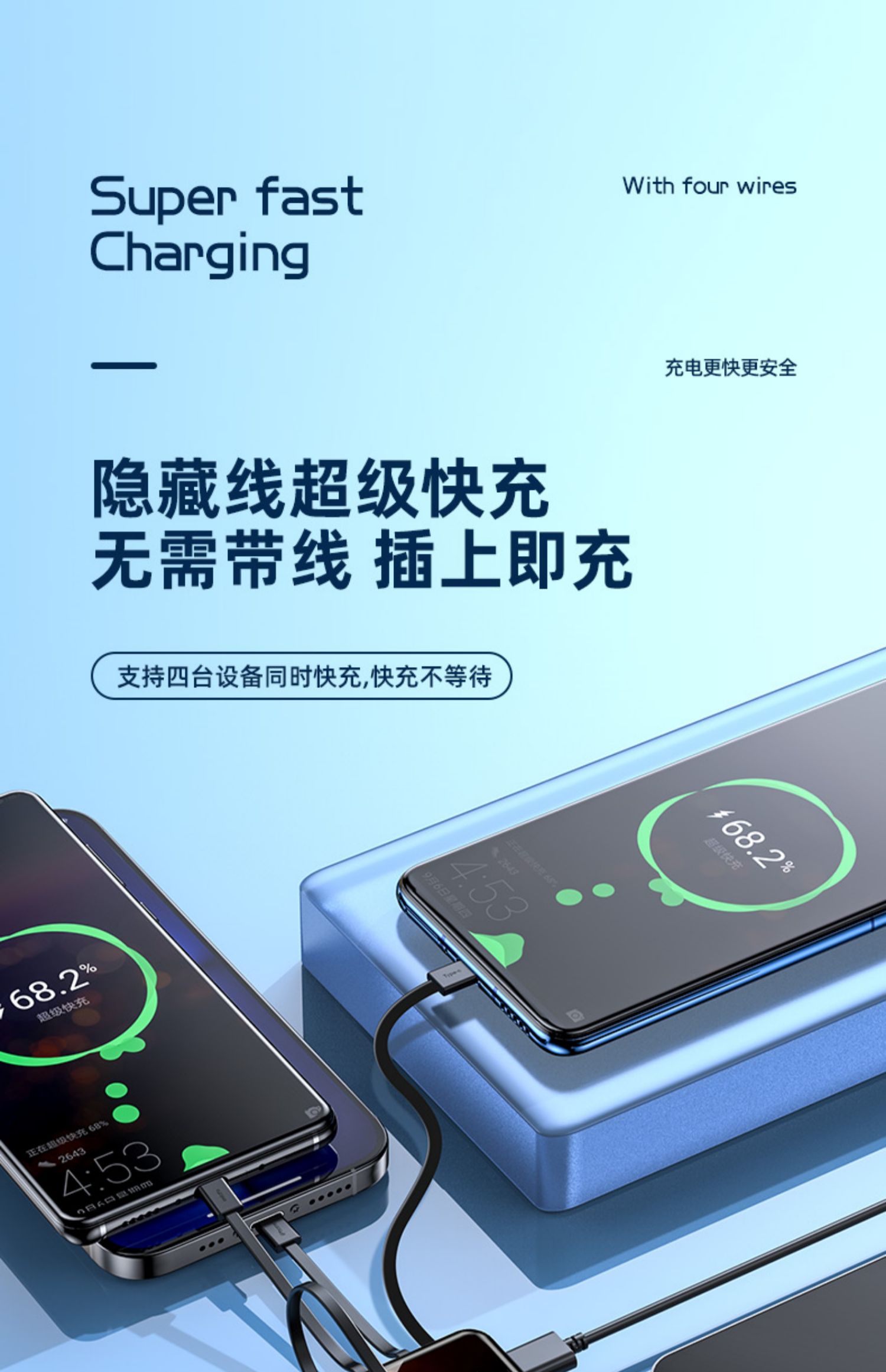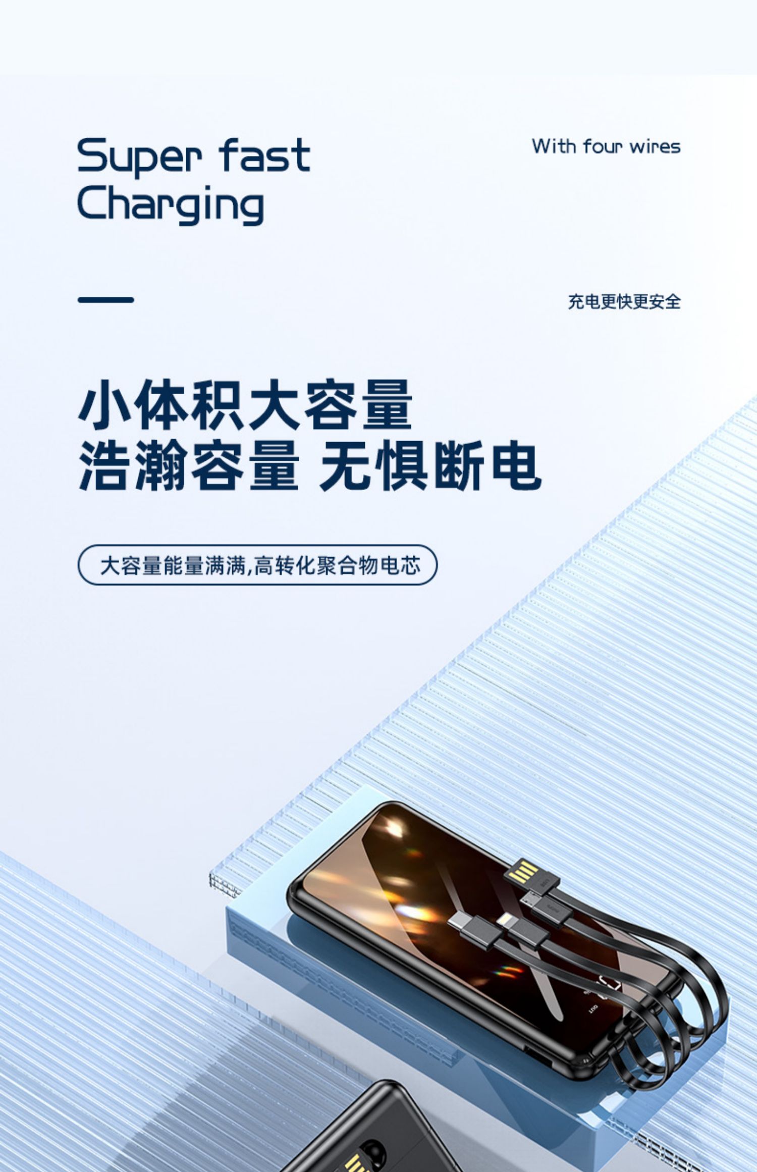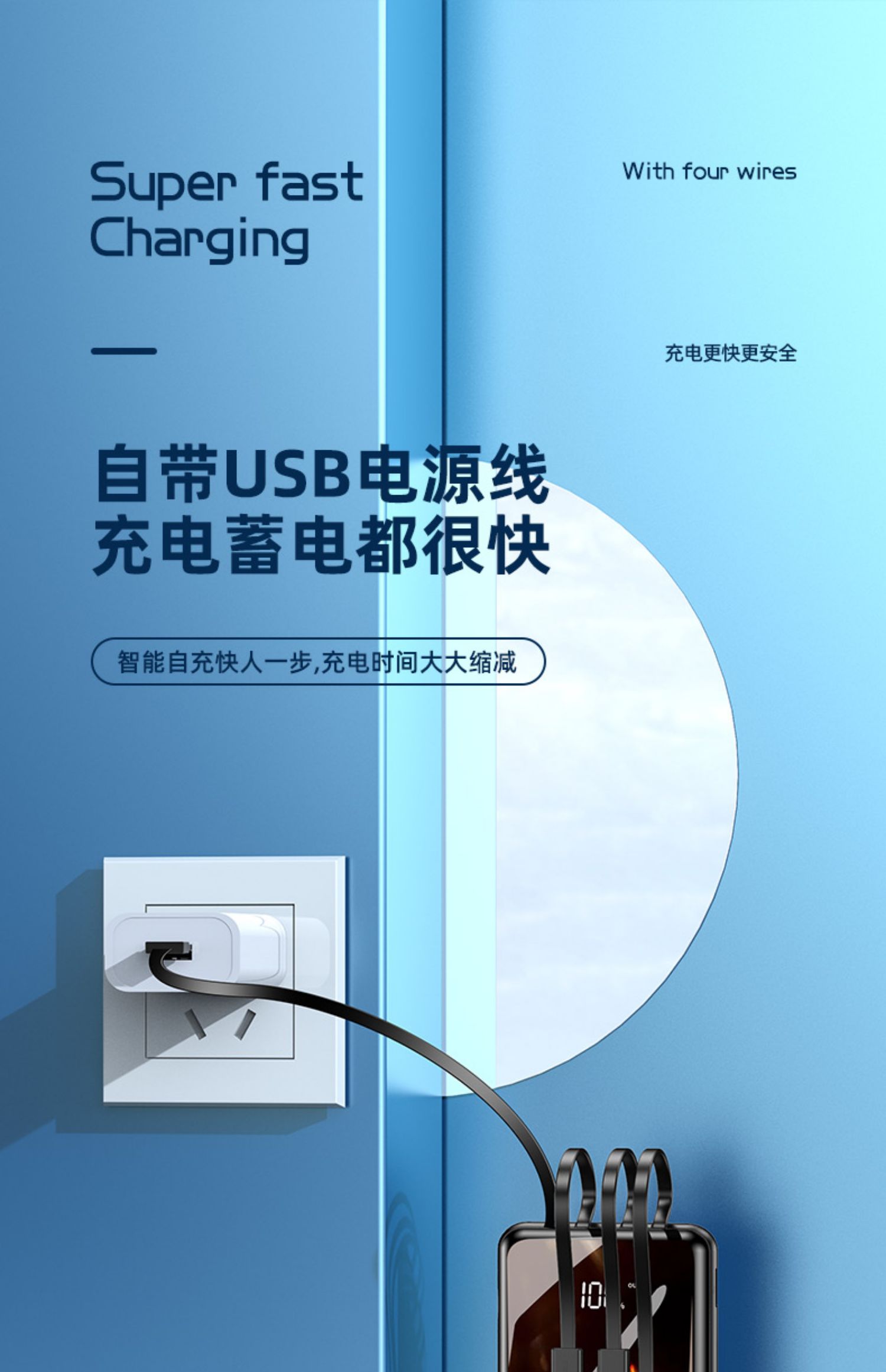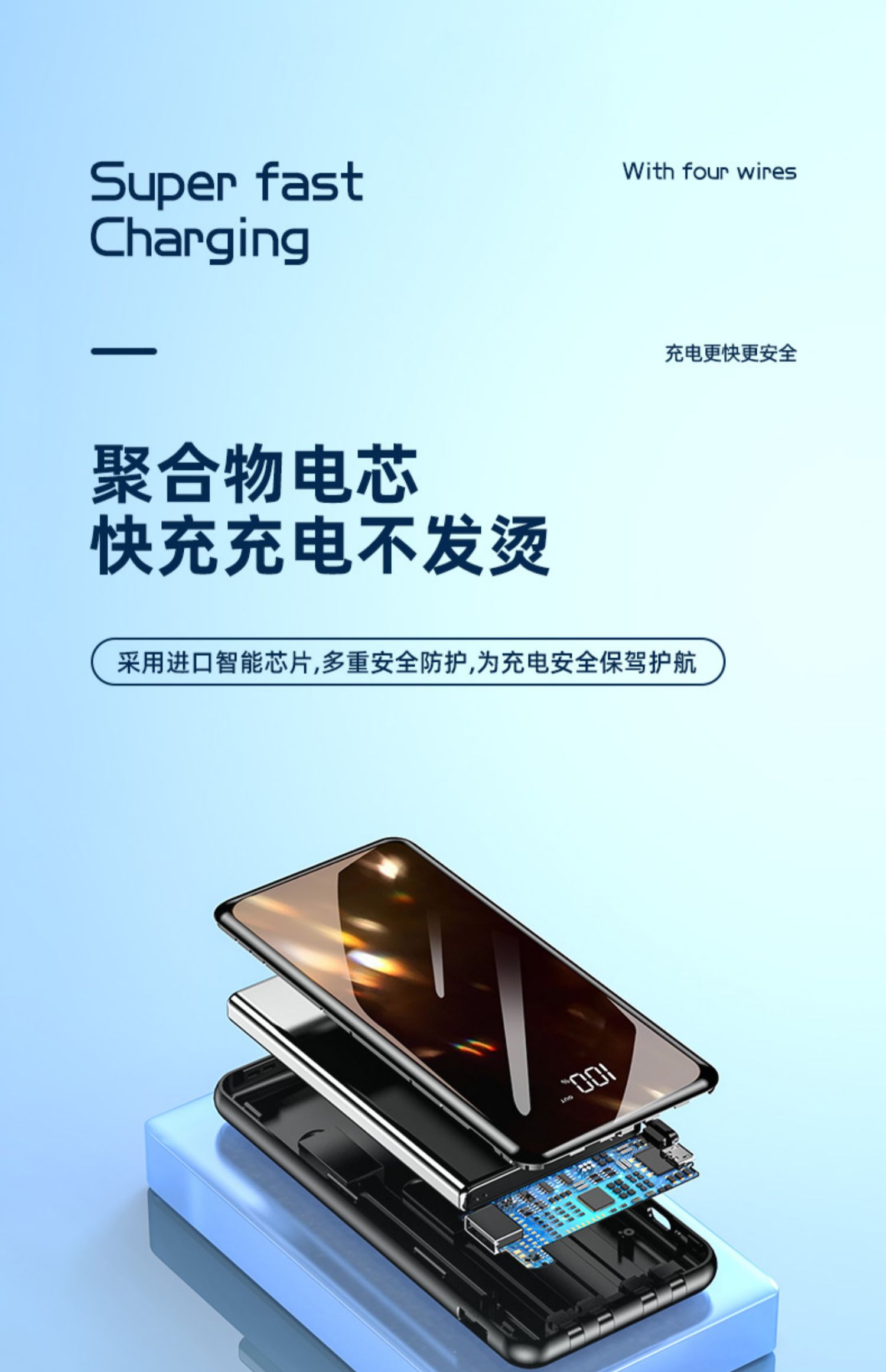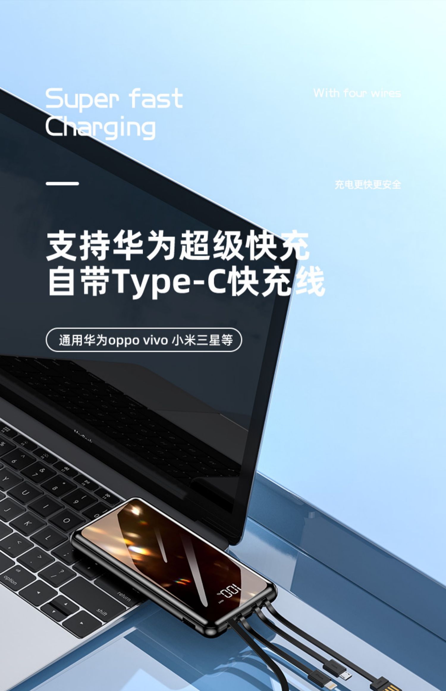 • 商品名称:自带线三合一充电宝20000毫安超薄小巧便携快充大容量适用华为小米苹果手机专用1000000超大量移动电源