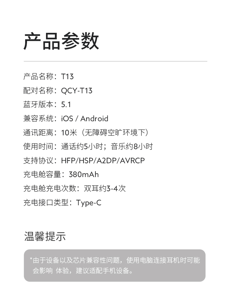 • 商品名称:QCY T13真无线蓝牙耳机入耳塞式单双耳运动跑步音乐通话超长续航