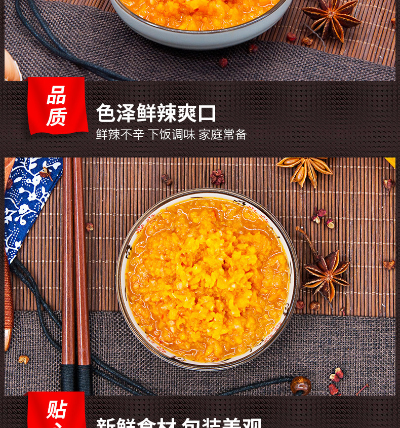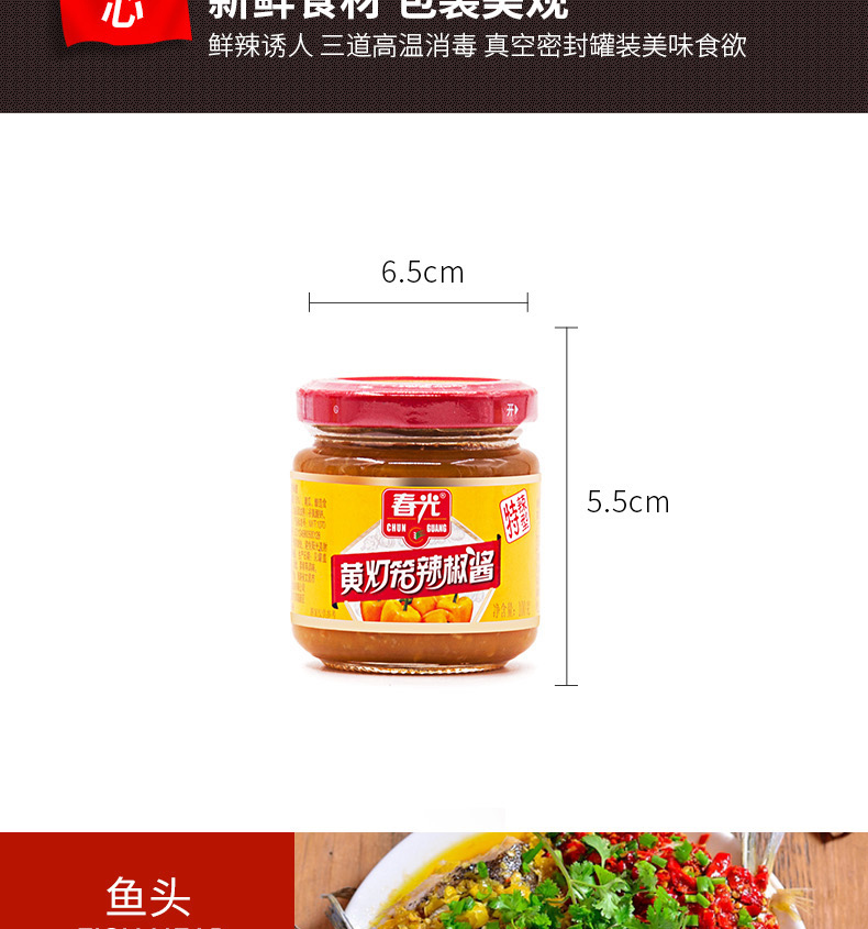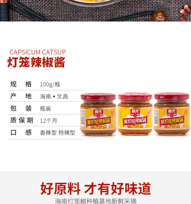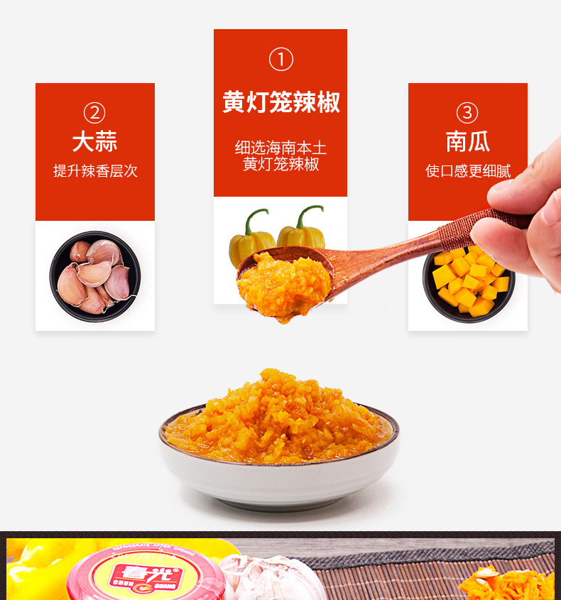 • 商品名称:春光食品海南特产传统黄灯笼辣椒酱100g*3剁椒酱蒜蓉酱鲜香辣椒酱