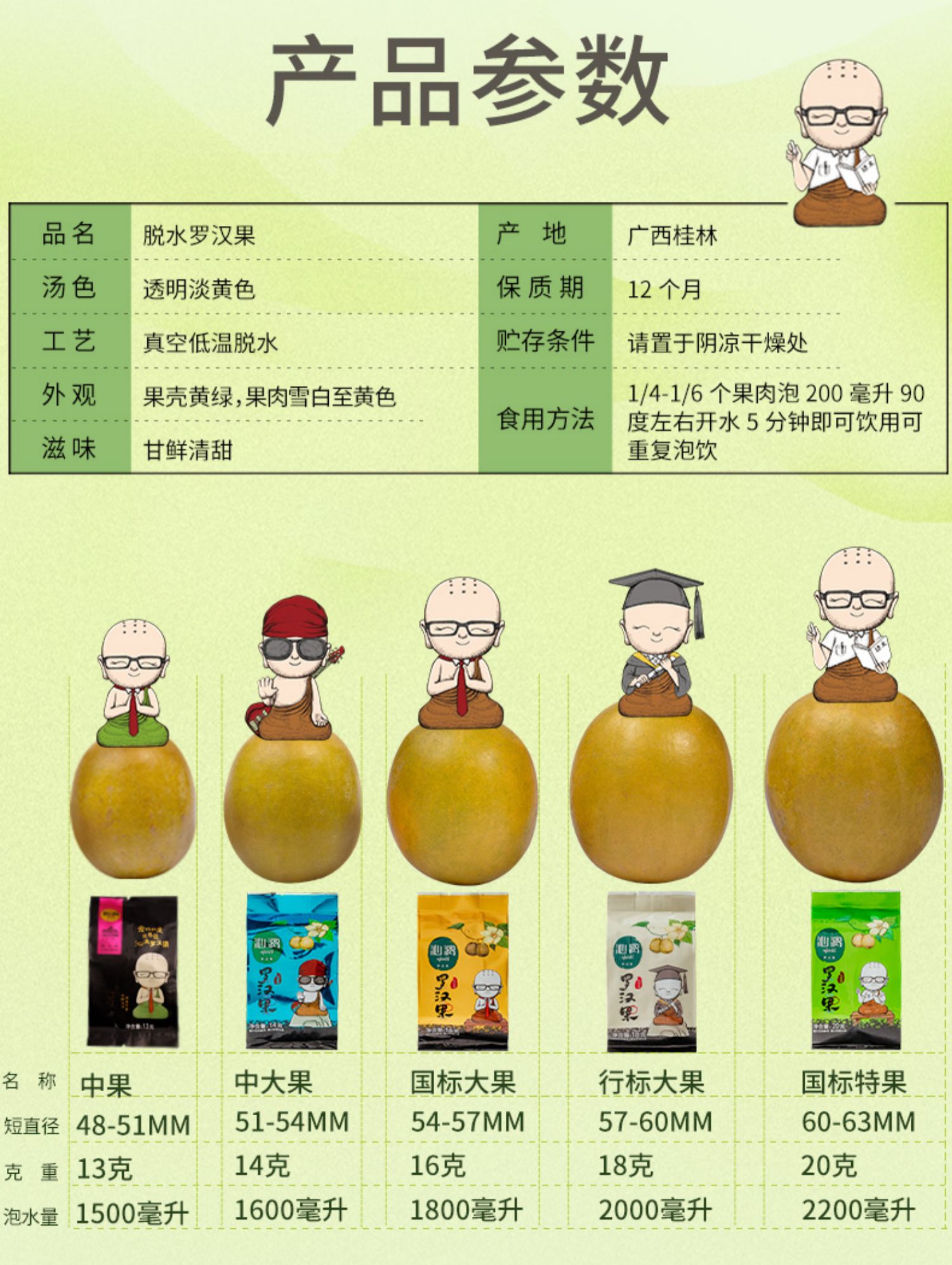 • 商品名称:沁漓罗汉果茶包独立包装广西桂林脱水黄金罗汉果干果泡茶大果散装