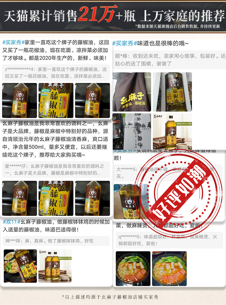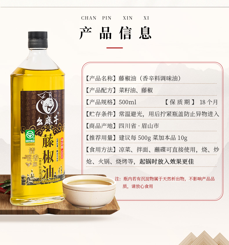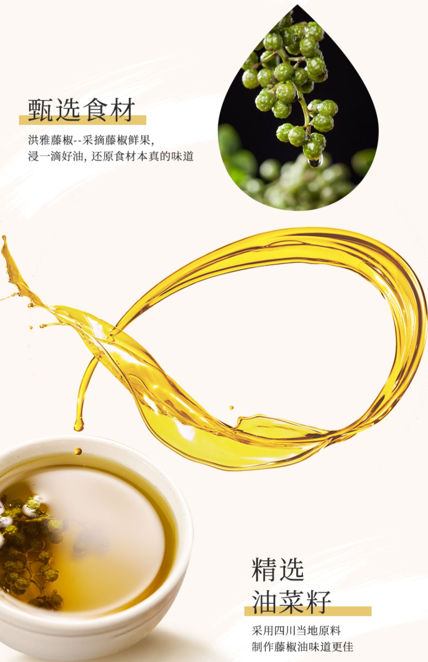 • 商品名称:幺麻子藤椒油500ml瓶装 花椒油四川特产麻油麻椒油家用特麻特香