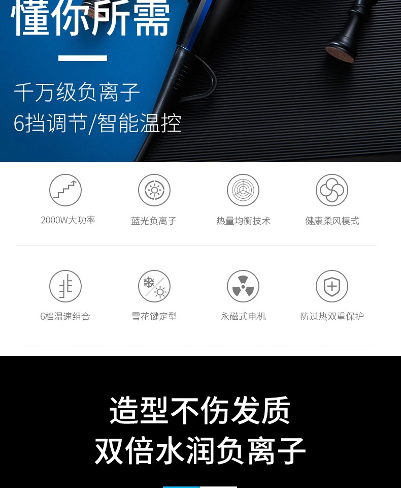 WATTS电吹风机家用发廊专业负离子大功率恒温冷热风电吹风筒
